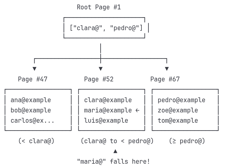 → children[1] = Page #52Note: B-trees use half-open intervals — ranges that are inclusive on the left and exclusive on the right. So the middle child is responsible for any key ≥ "clara@" and < "pedro@".